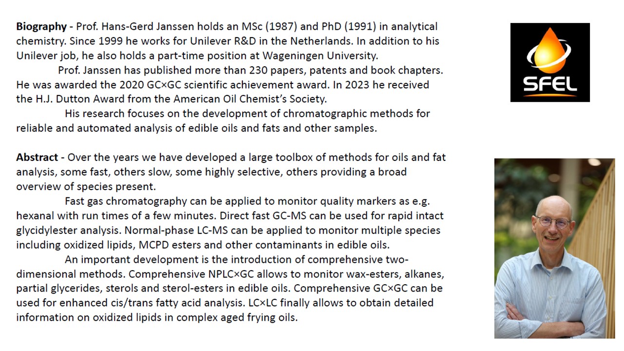 SFEL Webinar, Friday, January 30, 2026, 1:00 PM – 2:00 PM, by Hans-Gerd Janssen (Unilever – Wageningen University & Research): “Versatile and dedicated tools for the analysis of edible oils and fats”