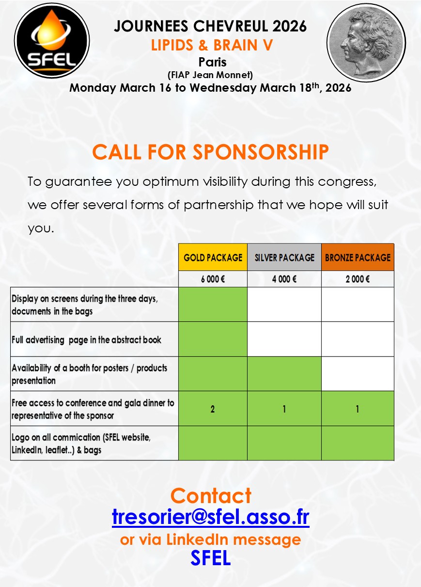 SFEL is a scientific association whose objective is to promote dissemination of knowledge in the field of lipids and challenges in research and development in this field (https://www.sfel.asso.fr/), mainly through the regular organization of scientific days "Journées Chevreul" and the publication of the journal “Oilseeds and fats, Crops and Lipids” (OCL, https://www.ocl-journal.org/fr/). Our society was created almost 80 years ago and formerly known as the "Association Française pour l'Etude des Corps Gras" (AFECG).