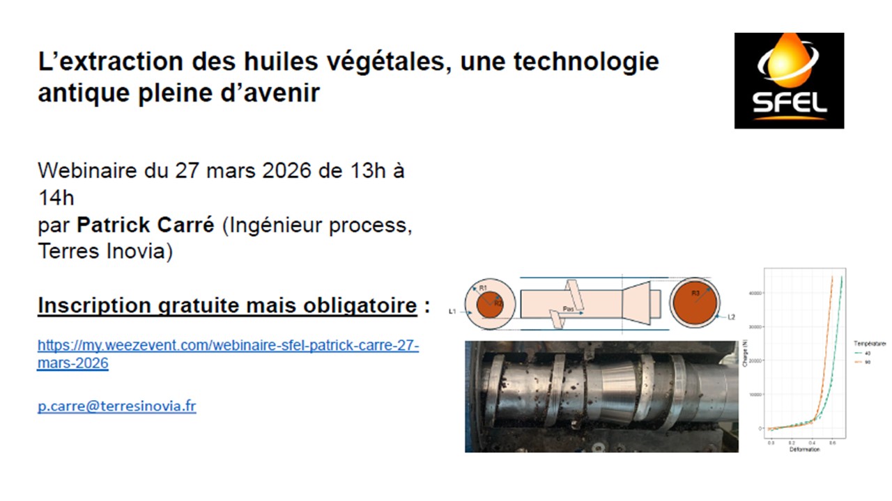 Webinaire SFEL Le vendredi 27 mars 2026 13h-14h par Patrick Carré (Ingénieur process, Terres Inovia) : « L’extraction des huiles végétales, une technologie antique pleine d’avenir »