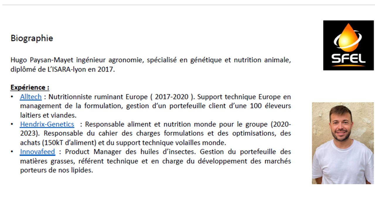 Webinaire du 15 décembre 2023 « L’huile d’insecte une nouvelle source de matière grasse performante et durable, quel avenir? »par Hugo Paysan Mayet (Innovafeed)